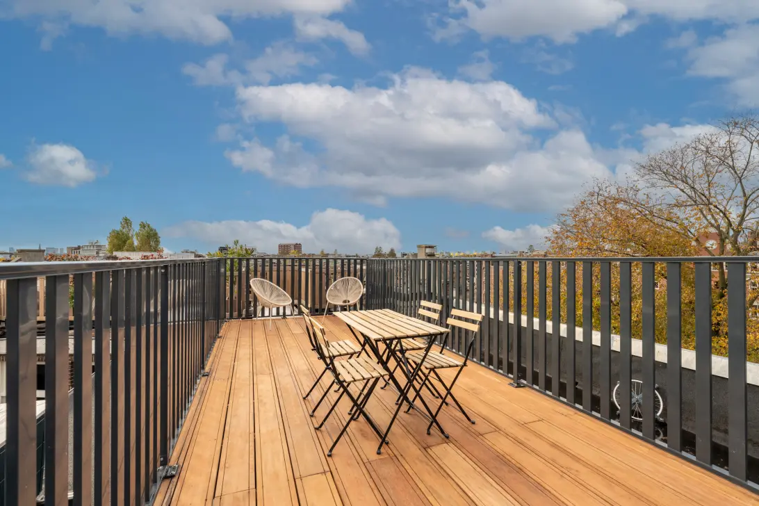 Het royale zonnige dakterras van ca. 32 m² met de hele dag zon en zicht op de Westertoren, is met zorg aangelegd: het dakterras is voorzien van Bankirai vloerdelen. Het is hier op elk moment van de dag heerlijk toeven met een kopje koffie, een lekkere maaltijd of een drankje na een drukke werkdag. Of ‘s avonds genieten van de ondergaande zon.
