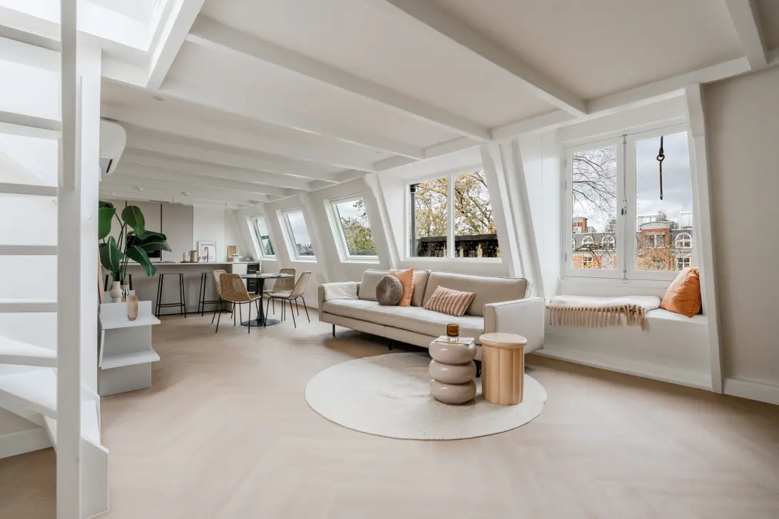 Volledig luxe gerenoveerd 3-kamerappartement van ca. 76 m² op vierde etage met heerlijk zonnig dakterras circa 32 m², airco en 2 slaapkamers