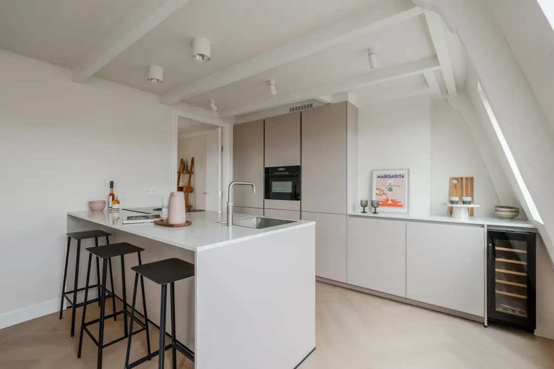 Dit fantastische en goed ingedeelde appartement is helemaal ‘af’ en dus klaar om te betrekken. Alles in deze woning ademt ‘NIEUW’ en ‘LUXE’ uit. Via het nette gemeenschappelijke trappenhuis, vernieuwd en voorzien van geluiddempend tapijt naar de derde en vierde etage, komt u op de derde etage bij de eigen entree. In de hal bevindt zich de meterkast en garderobe mogelijkheid. Via de trap komt u op de vierde etage in de ruime, lichte woonkamer met fraai balkenplafond en een visgraat PVC eiken-look vloer met vloerverwarming. Aan de linkerkant bevindt zich het separate (zwevend) toilet met fonteintje, de praktische berging met de hybride warmtepomp en wasmachine/droger opstelplaats, de toegang tot de badkamer en de trap naar het fantastische dakterras.