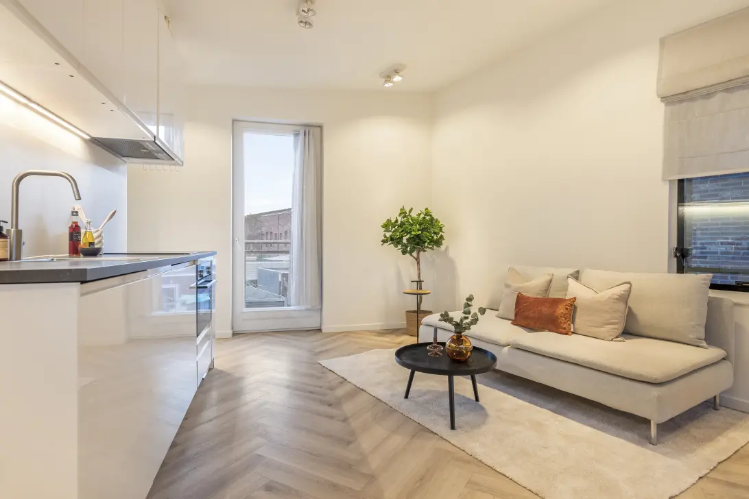 Middels de gezamenlijke entree op de begane grond bereik middels de trap het appartement op de eerste verdieping. Je komt binnen in de open ruimte hier bevindt zich de woonkamer met open keuken. Een fijne plek om zowel heerlijk op de bank te rusten als gezellig met vrienden koken en dineren. De keuken is voorzien van alle gemakkelijk waaronder het benodigde inbouwapparatuur. Daarnaast bevind zich aan de achterzijde een Frans balkon, ideaal om de deur daarvan lekker open te zetten op zonnige dagen.