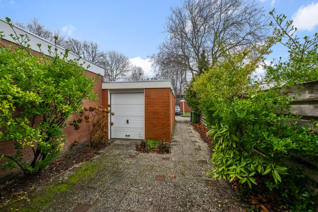 De woning beschikt over een diepe voortuin met garage. Door de ligging van de garage is er veel privacy. De ruime garage beschikt over twee overheaddeuren; een standaard overheaddeur aan voorzijde en een smallere overheaddeur aan achterzijde. De overheaddeur aan achterzijde is ideaal te gebruiken voor het stallen van een motor, scooter of fiets. De garage is naast het stallen van een auto of motor ook geschikt om te gebruiken als hobbyruimte. De achtertuin ligt op het zuidoosten, dus heerlijk veel zon in de tuin! Er is vrij uitzicht aan achterzijde en er is een achterom.