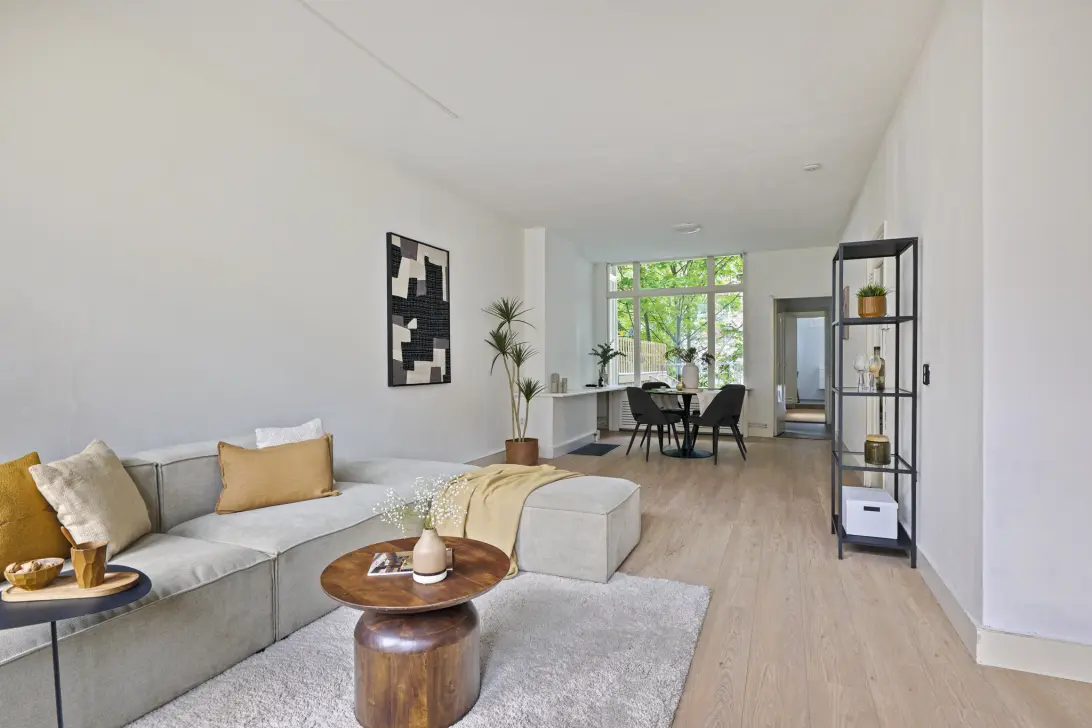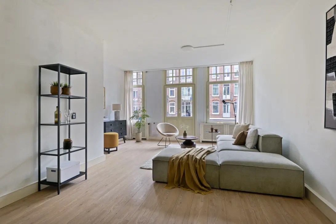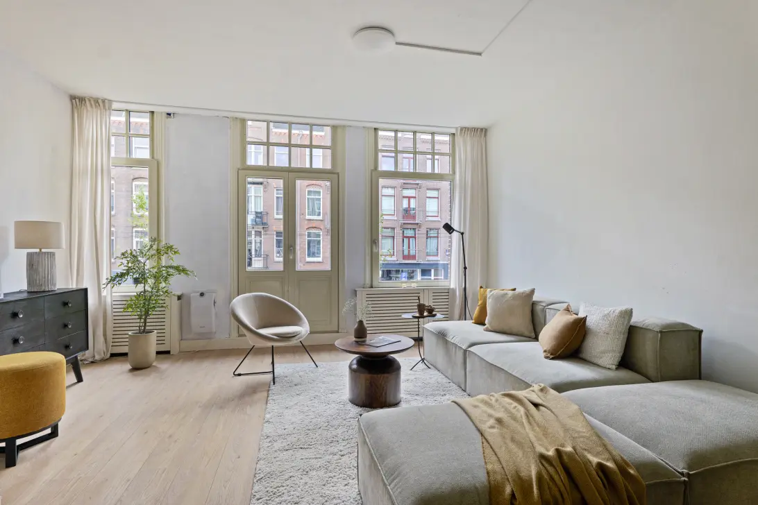Spacious and bright 66 m² apartment on leasehold land purchased in perpetuity and with a large roof terrace at the rear in Amsterdam Oud-West.