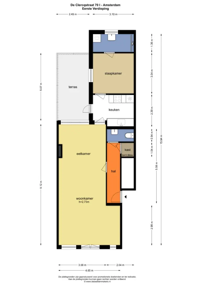 Eerste verdieping: Portiek, eigen entree, gang, toilet, meterkast, doorzon woonkamer, dichte keuken met toegang tot dakterras, slaapkamer, badkamer met douche, wastafel en aansluiting voor een wasmachine.