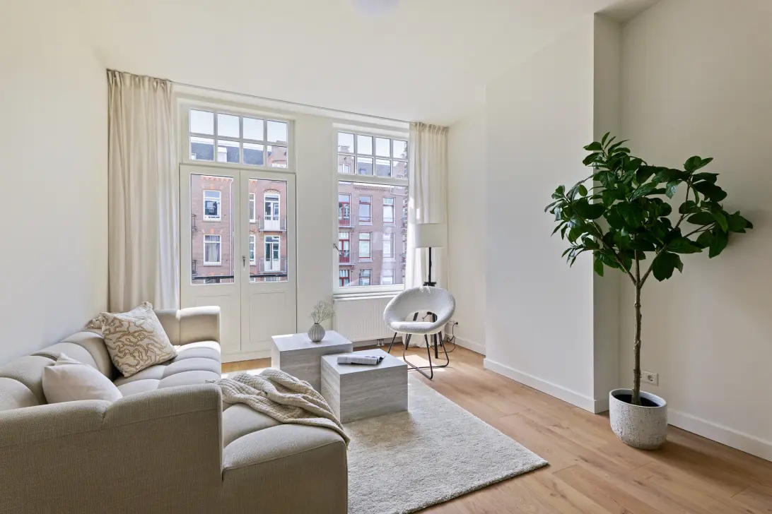 Ruim en licht appartement van 79 m2 op eeuwigdurend afgekochte erfpachtgrond met een balkon aan de achterzijde in Amsterdam Oud West.