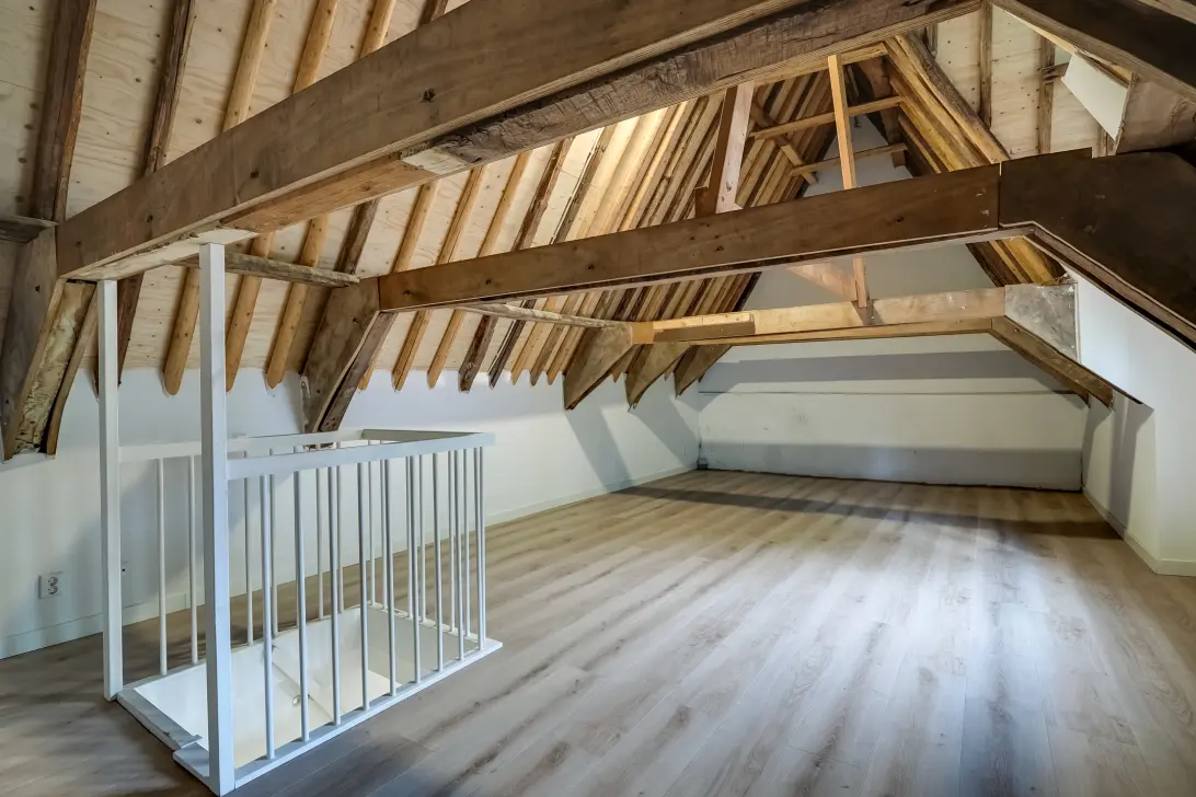 In de woonkamer bevindt zich een trap waarmee u de ruime slaapkamer op de zolderverdieping bereikt. Deze slaapkamer heeft de prachtige hoogte van bijna 5 meter en is afgewerkt met houten balken, wat voor veel sfeer zorgt. Door de beide ramen heeft de slaapkamer een frisse uitstraling.