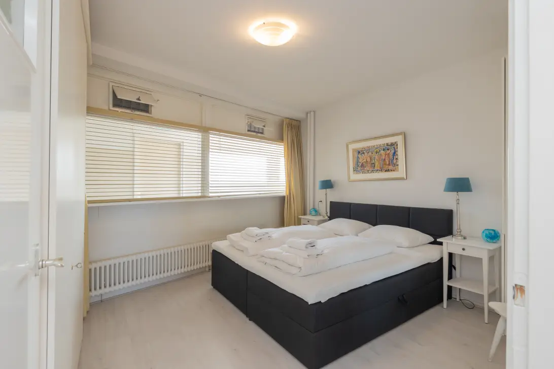 Vanuit de hal kom je in de ruime slaapkamer met linnenkast en deze kamer ligt aan de landkant van het appartement.