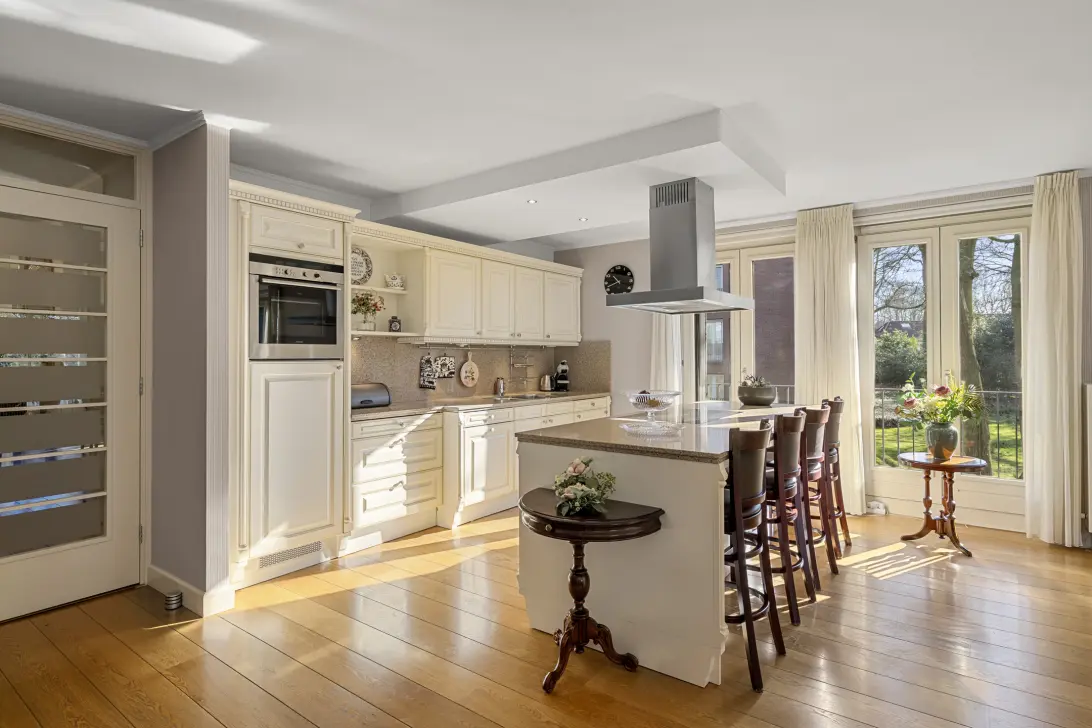 Vanuit de woonkamer heeft u toegang tot het overdekte terras, waar u heerlijk beschut kunt zitten en genieten van het uitzicht. De Franse balkons aan de oostzijde kunnen volledig worden geopend, waardoor u nog meer van de groene omgeving naar binnen haalt.