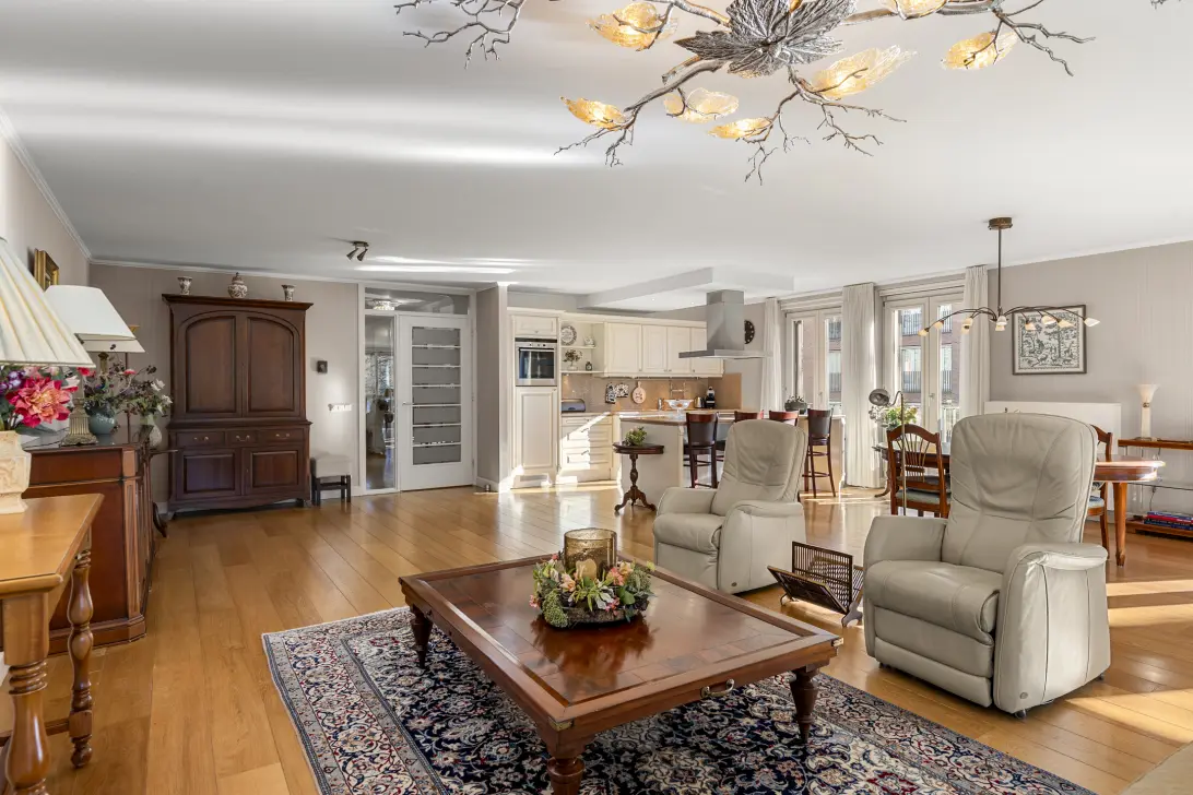 De zeer ruime woonkamer is de blikvanger en vormt een heerlijke leefruimte waar u zich direct thuis zult voelen. De grote raampartijen op het oosten en het zuiden zorgen voor een prachtige lichtinval en bieden een mooi uitzicht op de parkachtige en groene omgeving, wat een ruimtelijk en open gevoel geeft. Dankzij de royale afmetingen biedt de woonkamer volop mogelijkheden voor verschillende zithoeken, zoals een comfortabele zithoek en een plek om te leren of van muziek te genieten. Ook is er ruimte voor een grote eettafel.