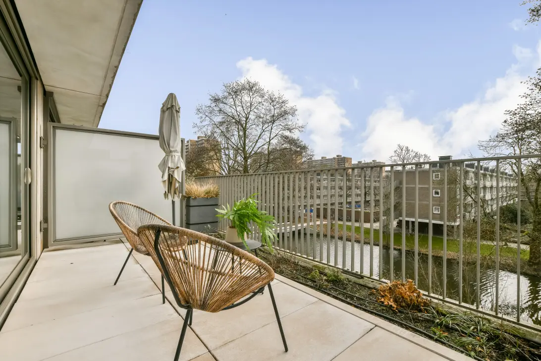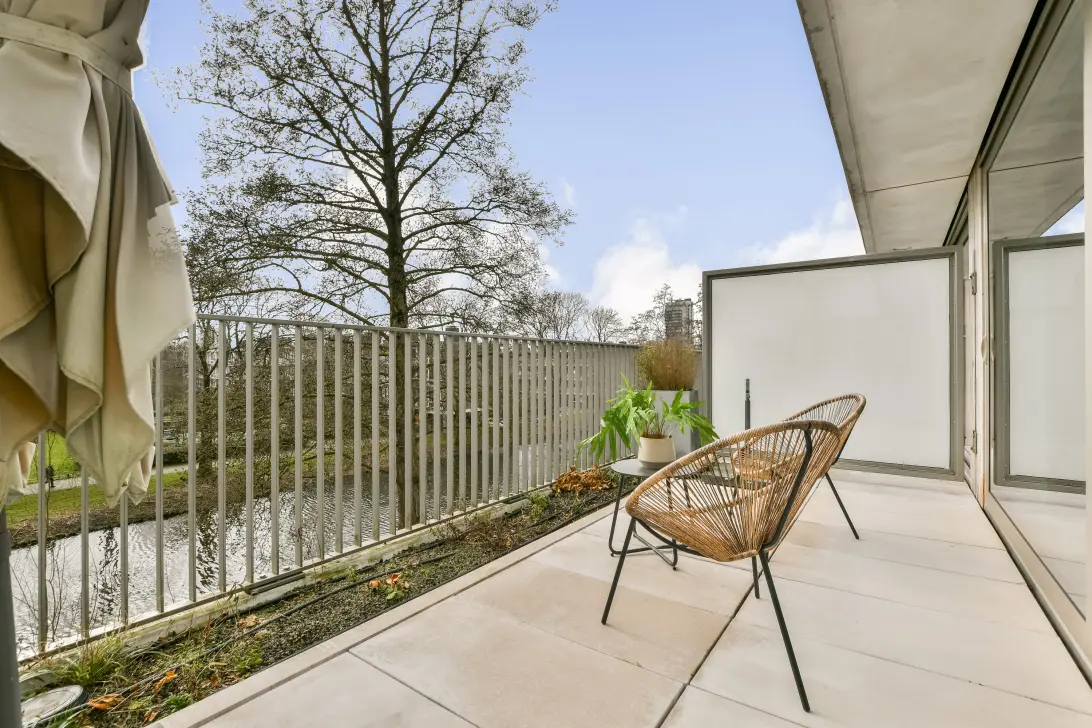 Het absolute hoogtepunt van de woning is het royale terras op het zuiden. Dit buitenverblijf fungeert als een natuurlijk verlengstuk van de woonkamer en biedt volop zon, privacy en een vrij groen uitzicht. Een plek waar binnen en buiten naadloos in elkaar overlopen.