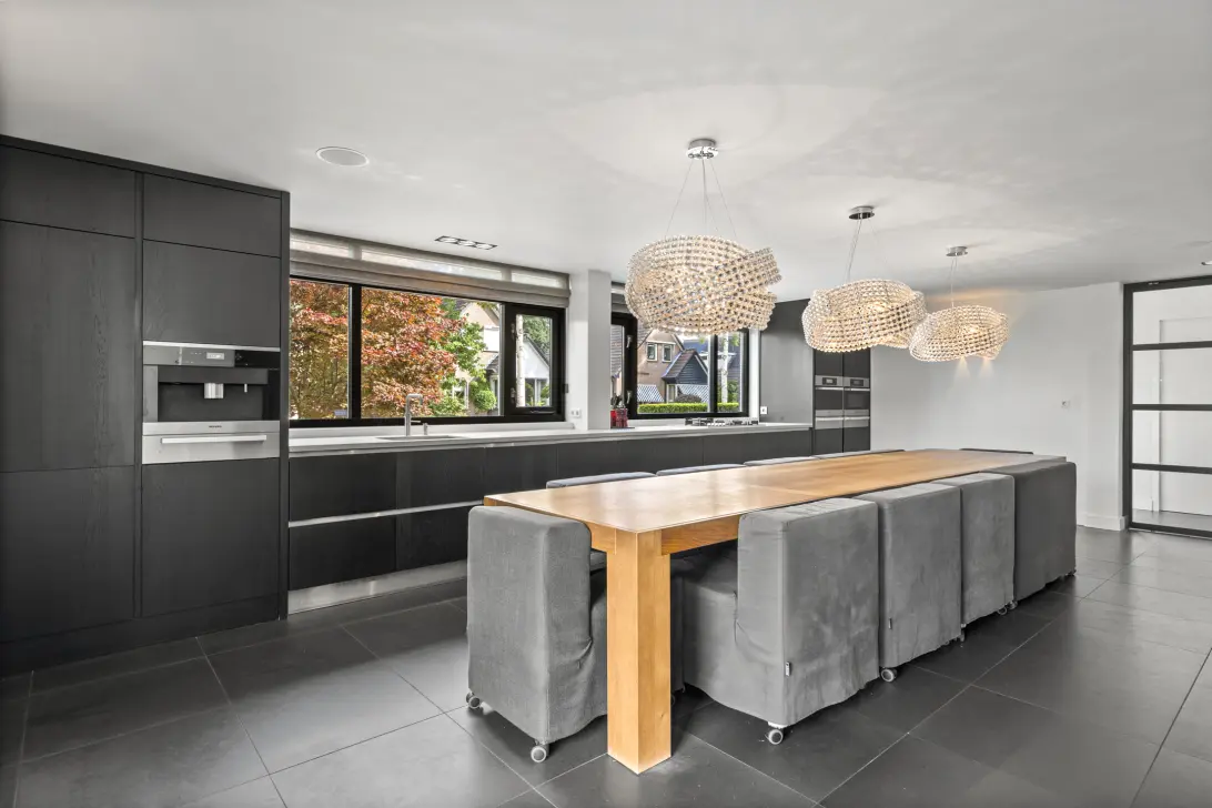 Een echte eyecather is de stalen dubbele taatsdeur richting de woonkeuken, dit zet meteen toon voor de rest van de woning! De keuken versterkt als hoogwaardig meubelstuk de beleving van deze woning en is voorzien van de nodige inbouwapparatuur: een 5-pits gasfornuis met afzuigkap, een stoomoven, combi-oven, koffiemachine en een koelkast. Verder heeft de keuken een vaatwasser, warmhoudlades en een Quooker met spa rood/blauw functie. Er is voldoende plek voor het plaatsen van een mooie eethoek bij de gashaard. Of u nu houdt van uitgebreid dineren of gewoon gezellig wilt ontbijten, hier vindt u de rust en ruimte om elke maaltijd een bijzonder moment te laten zijn.