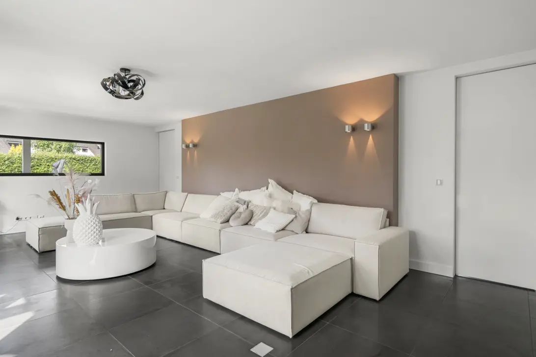 De speels ingedeelde woonkamer met de open haard als sfeervol middelpunt, vormt het hart van de begane grond en biedt alle gelegenheid om te ontspannen of gasten te ontvangen. Een unieke ambiance van tijdloze elegantie en een fijn thuis! Over alles is nagedacht: van het verlichtingsplan tot het contact met de tuin en de verbinding met de andere vertrekken. Vervolg uw weg naar de TV kamer voorzien van airconditioning. Net als alle andere vertrekken op de begane grond is deze ruimte strak en licht afgewerkt en voorzien van vloerverwarming. Heerlijk in de koude wintermaanden! Daarbij zorgt de mooie basalt vloer voor een perfect contrast én warme uitstraling. Een opvallend kenmerk in beide kamers is de naadloze overgang met de tuin middels de openslaande deuren. Dit zorgt voor een maximale binnen-buitenbeleving!