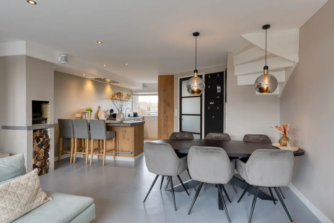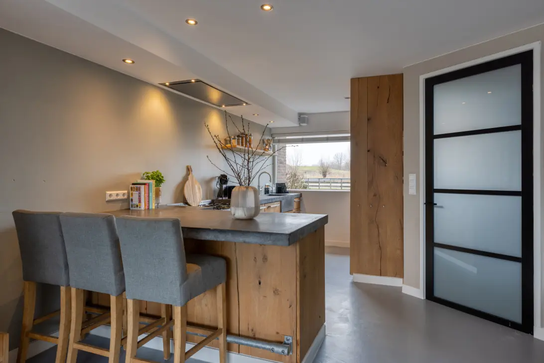 At the front is the spacious and luxurious kitchen with breakfast bar, featuring oak fronts and a concrete worktop. The kitchen is equipped with a Boretti gas stove with oven and grill, integrated extractor hood, steam oven and multifunctional oven (both Miele), dishwasher, Quooker tap and a fridge/freezer (Siemens).