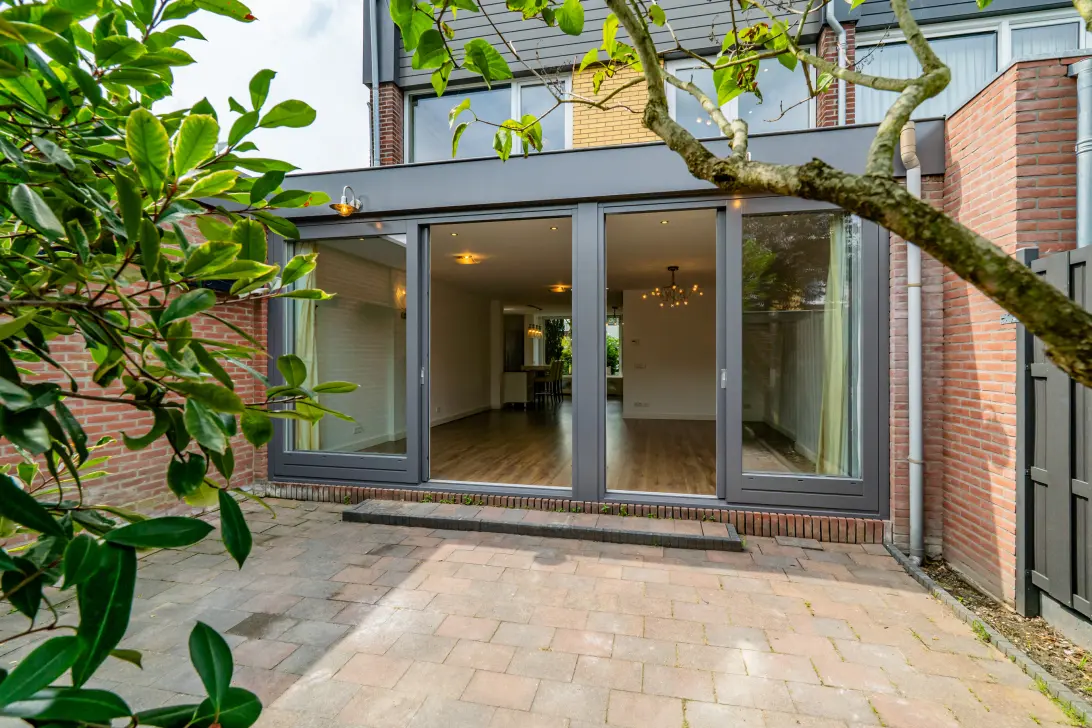 - Uitgebouwde woonkamer met veel lichtinval, mede dankzij de erker aan de zijkant en de grote schuifdeuren naar de tuin.