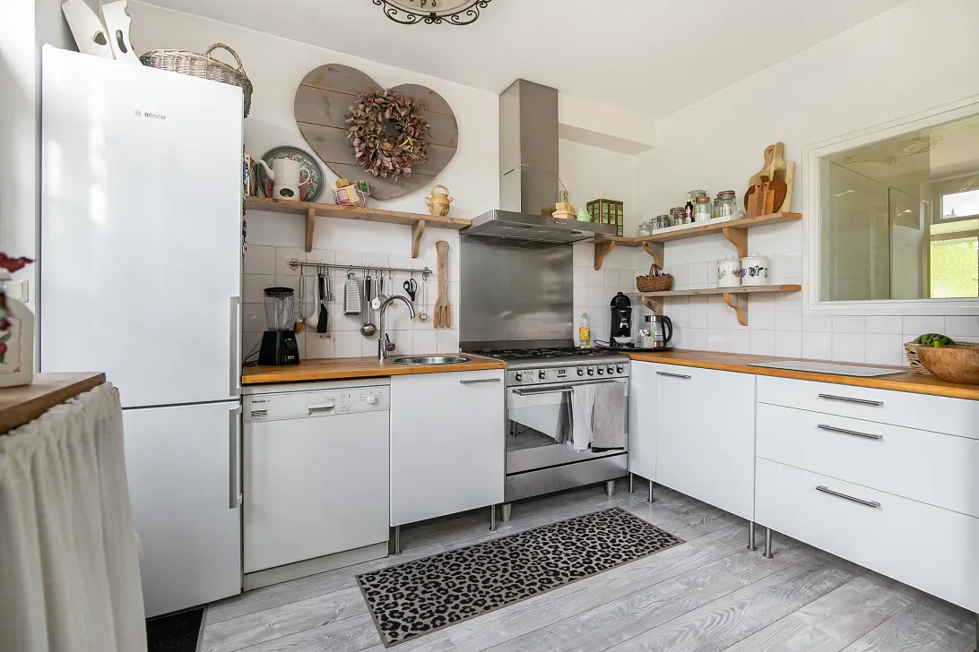De moderne, frisse keuken grenst aan de woonkamer en is van alle gemakken voorzien. Van een grote koelkast voor alle boodschappen tot een vaatwasser die je werk uit handen neemt – hier kook je met plezier. Heb je de grote voorraadkast al gezien? Perfect voor alles, van pannen en keukengerei tot die favoriete fles wijn op temperatuur klaar hebt staan.