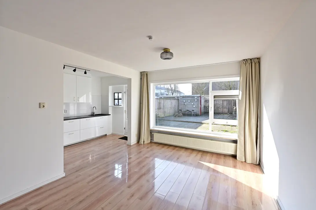 Via de entree bereikt u de ruime en lichte woonkamer met een prettige doorzonopstelling en grote raampartijen aan de achterzijde. Hierdoor beschikt de leefruimte over veel natuurlijke lichtinval en een aangenaam ruimtelijk gevoel. De woonkamer is afgewerkt met een nette laminaatvloer en strak afgewerkte wanden, waardoor een goede basis aanwezig is voor diverse interieurstijlen.