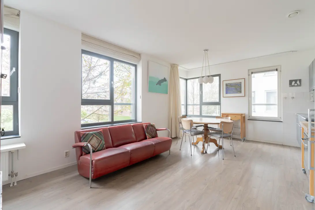Door de hoekligging is er een zeer lichte woonkamer welke is voorzien van een open keuken, deze kamer kan simpel met ca 16 m2 worden vergroot door de slaapkamer bij de woonkamer te betrekken.