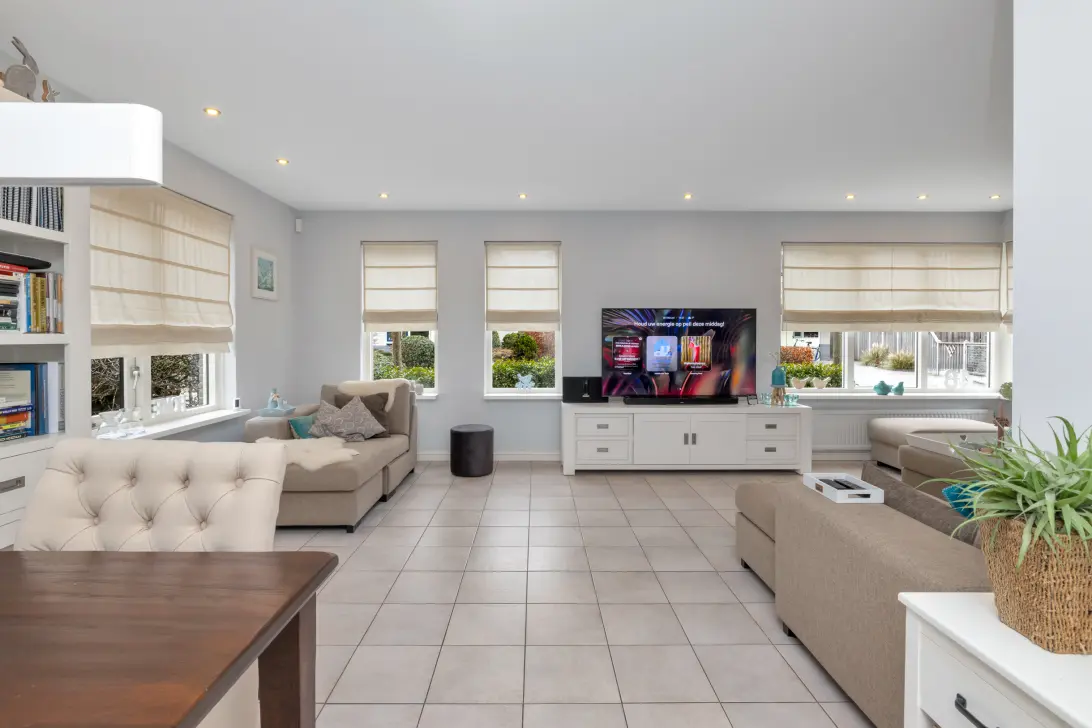 De woonkamer ligt aan de voorzijde en voelt warm en uitnodigend aan, terwijl de keuken aan de achterzijde is gesitueerd en nog meer privacy biedt.