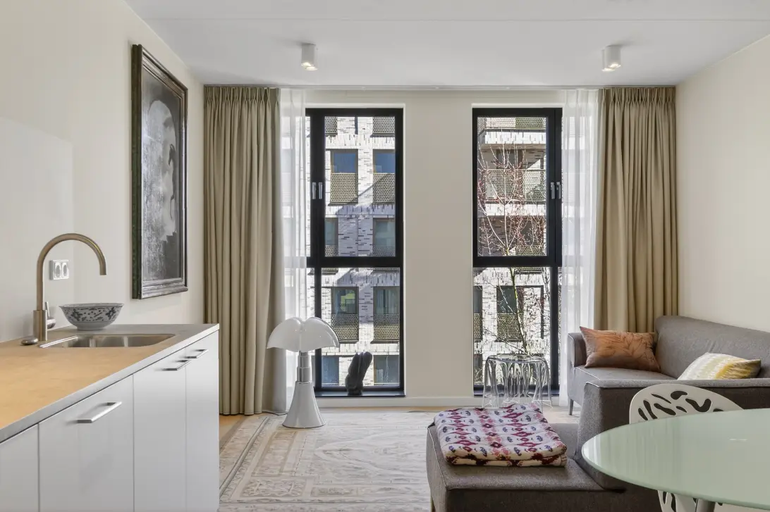 Het zitgedeelte is royaal opgezet en biedt plek voor een ruime hoekbank. De grote raampartijen zorgen voor veel lichtinval en geven de woning een open karakter. De ramen zijn uitgevoerd als openslaande kiepramen en lopen door tot aan de volledige hoogte van het appartement. De gehele woning is voorzien van pvc vloer en heeft comfortabele vloerverwarming (en vloerkoeling).