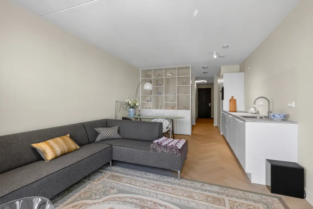 De woning is slim ingedeeld, waarbij de verschillende leefruimtes prettig van elkaar te scheiden zijn. Het slaapgedeelte is stijlvol afgescheiden middels een ingebouwde open kastenwand, wat zorgt voor zowel privacy als een speels en ruimtelijk effect. Aangrenzend bevindt zich nog een extra ingebouwde kastenwand die naadloos overloopt in de keuken.