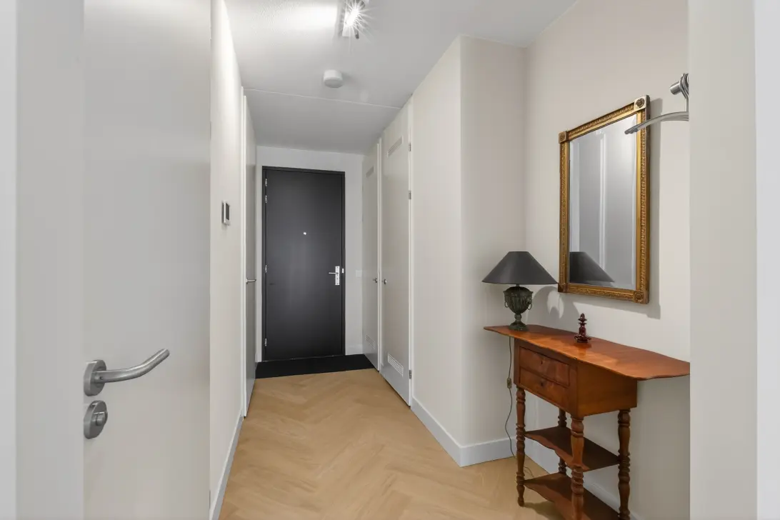 De verzorgde entree van het moderne gebouw biedt toegang tot de centrale hal met lift en architectonisch fraai trappenhuis. De trap of lift brengt je naar de derde verdieping waar het appartement is gelegen.
