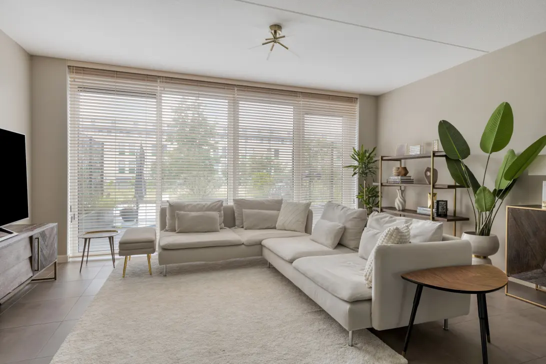 Entree tot de woning, ruime hal met toegang tot de separate toiletruimte met fontein en welke is voorzien van luxe tegelwerk, uitgebreide meterkast voorzien van glasvezel, stookruimte voorzien van wasmachineaansluiting, W.K.O- unit en WTW-systeem. Via de zwart stalen deur is de lichte woonkamer te betreden welke is voorzien van een appartement brede glazen pui die uitkijkt op het groene (nog aan te leggen) binnenterrein. De loggia is via de woon- en slaapkamer toegankelijk en beschikt over fraaie harmonicaramen, die je volledig open kan zetten. Heerlijk overdekt zitten en toch buiten zijn!