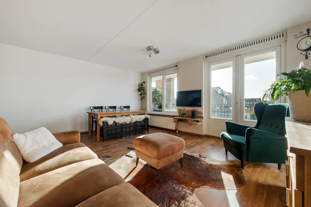 The living room is wonderfully bright and has French doors leading to the balcony. Thanks to its central location, you'll be within easy reach of both Amsterdam and Haarlem, with shops, the train station, bus stops, Sugar City, and the Spaarnwoude recreation area all within walking distance. The apartment also includes a private parking space at the front of the complex.