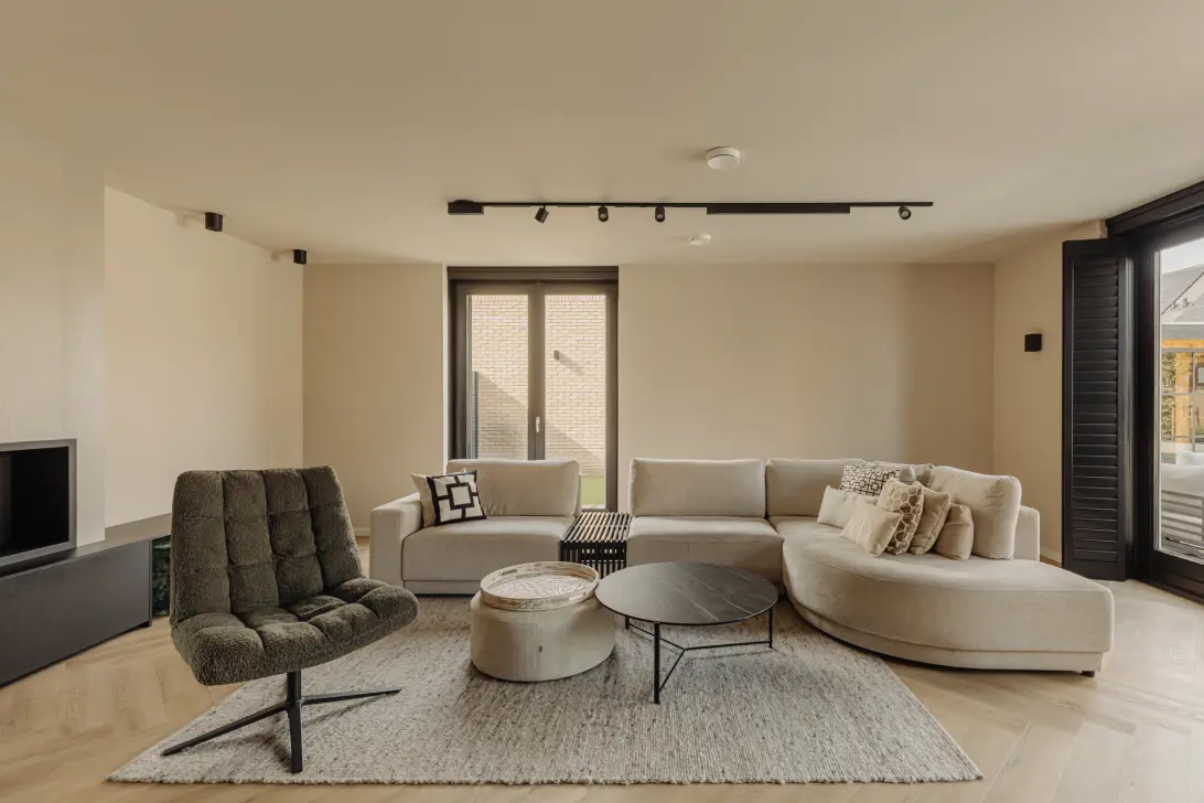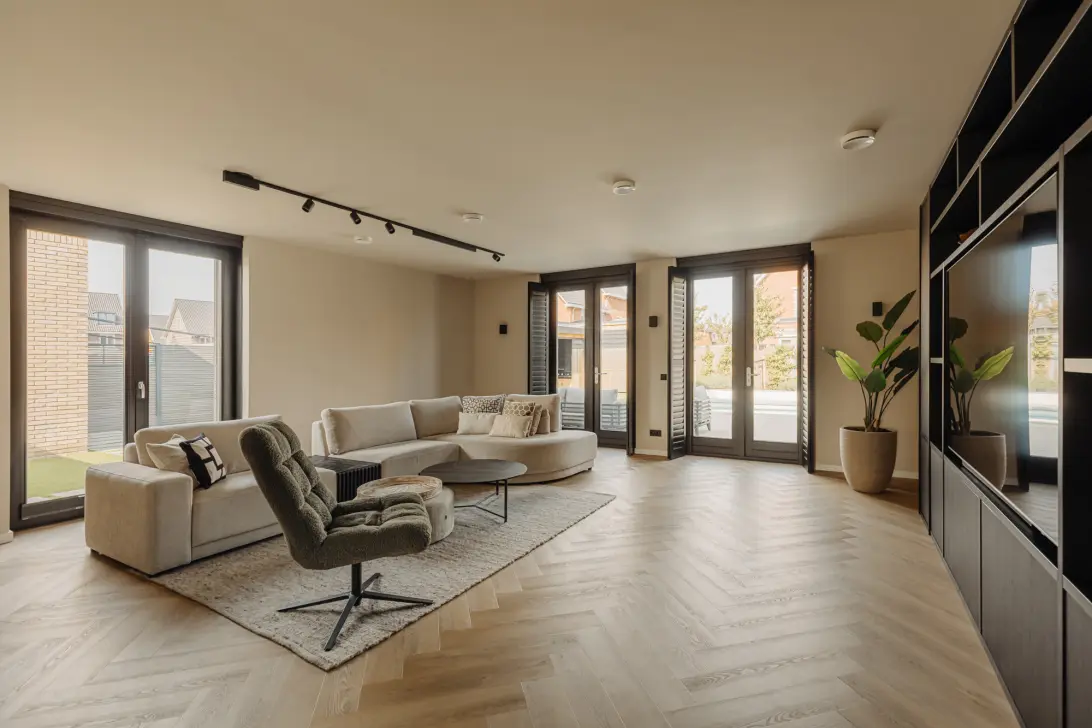 Upon entering, you are welcomed by a spacious and light interior, finished with luxurious materials in natural tones. Entrance, spacious hall, meter cupboard, modern toilet, custom-made wardrobe space under the stairs, access to the living room via the luxurious steel sliding door with glass. The spacious living room offers space for the whole family, with an atmospheric bio-ethanol fireplace for extra warmth and coziness. The living room gives direct access to the sunny garden through the patio doors.