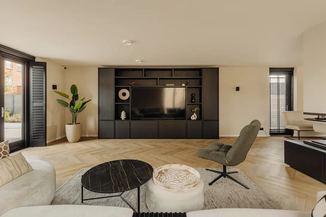Bij binnenkomst word je verwelkomd door een ruimtelijk en licht interieur, afgewerkt met luxe materialen in natuurlijke tinten. Entree, royale hal, meterkast, moderne toiletruimte, op maat gemaakte garderoberuimte onder de trap, toegang naar de living via de luxe stalen schuifdeur met glas. De ruime living biedt plek voor het hele gezin, met een sfeervolle bio-ethanol haard voor extra warmte en gezelligheid. De living geeft directe toegang tot de zonnige tuin via de openslaande deuren.
