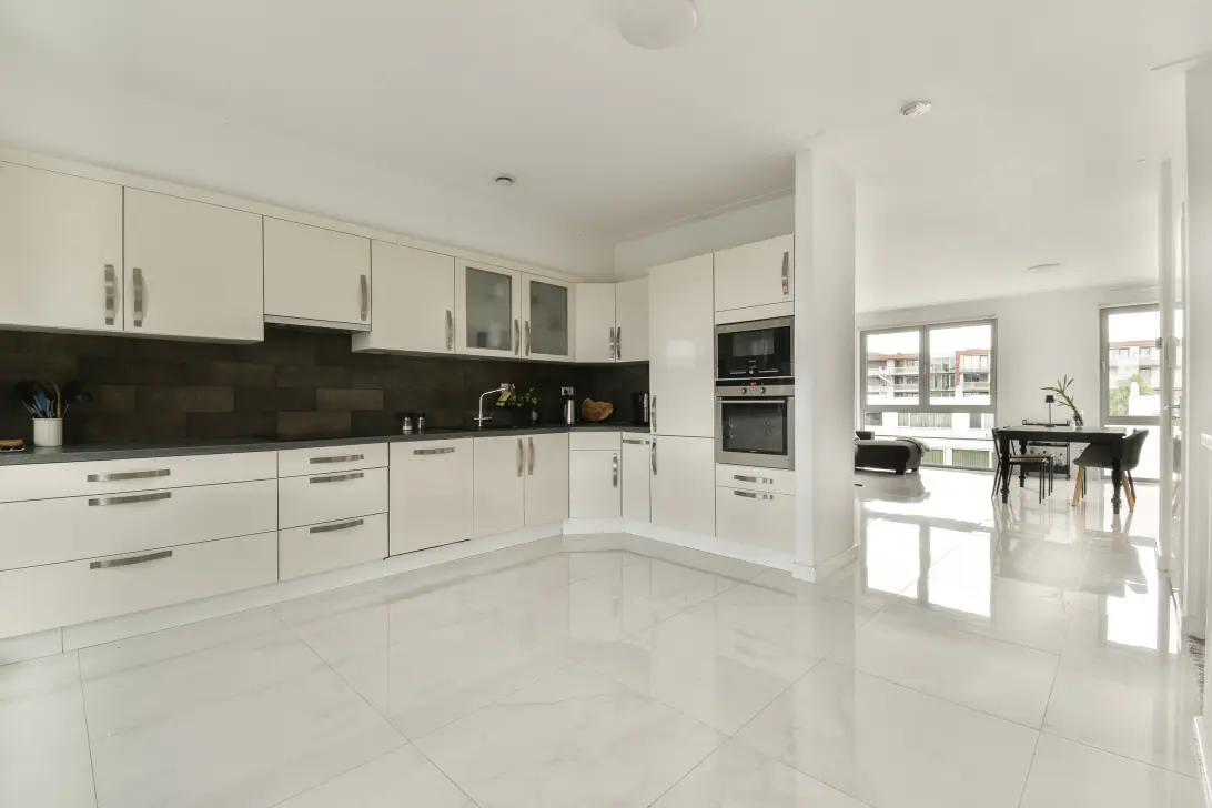 Generous living room and open kitchen: Large windows allow natural light to pour in, while the kitchen is fully equipped with built-in appliances.