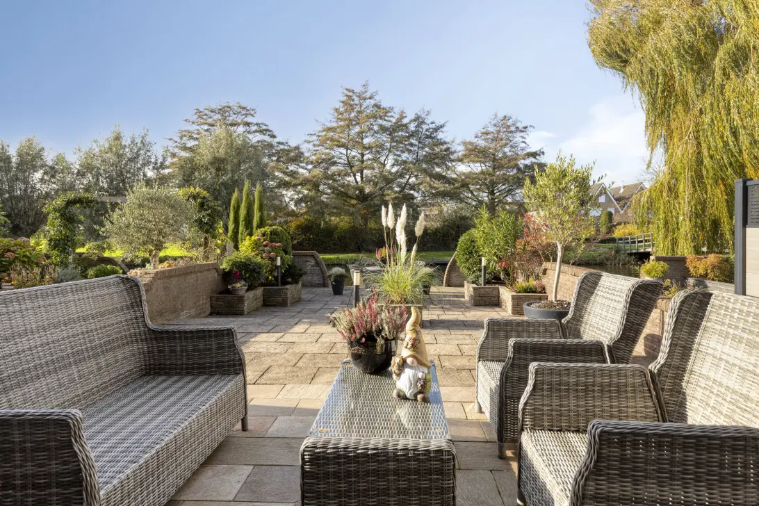 De achtertuin ligt op het westen, is mooi aangelegd met een zonneterras, grenst aan een brede waterpartij en biedt een heerlijk uitzicht, goede zonligging en privacy. Vanaf het begin van de middag tot de prachtige zonsondergang is het hier echt genieten geblazen.