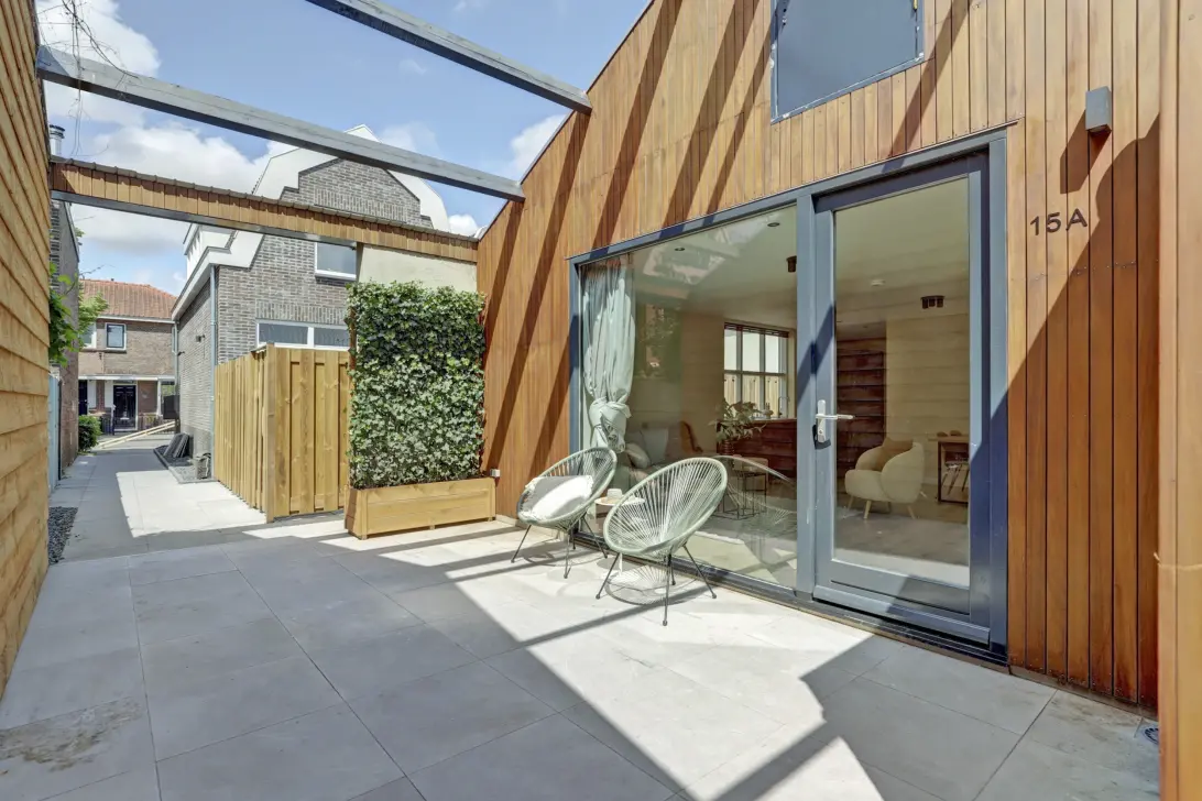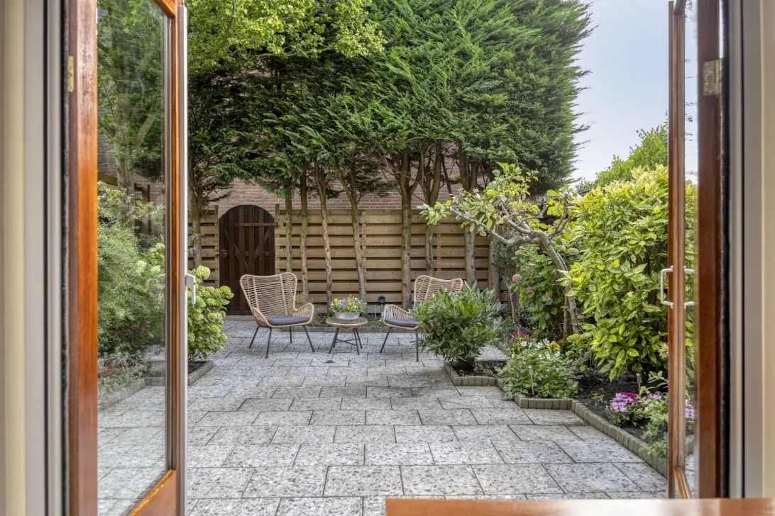 Hoe fijn is dat! Dit appartement heeft geen krap balkon, maar een leuke tuin met een achterom. Deze betreed je via de openslaande deuren. Een flink deel van de tuin is bestraat, en in de borders zie je gevarieerde beplanting. Groenblijvend, met bloemen en coniferen die voor privacy zorgen. Wordt dit je nieuwe thuis in Koog?