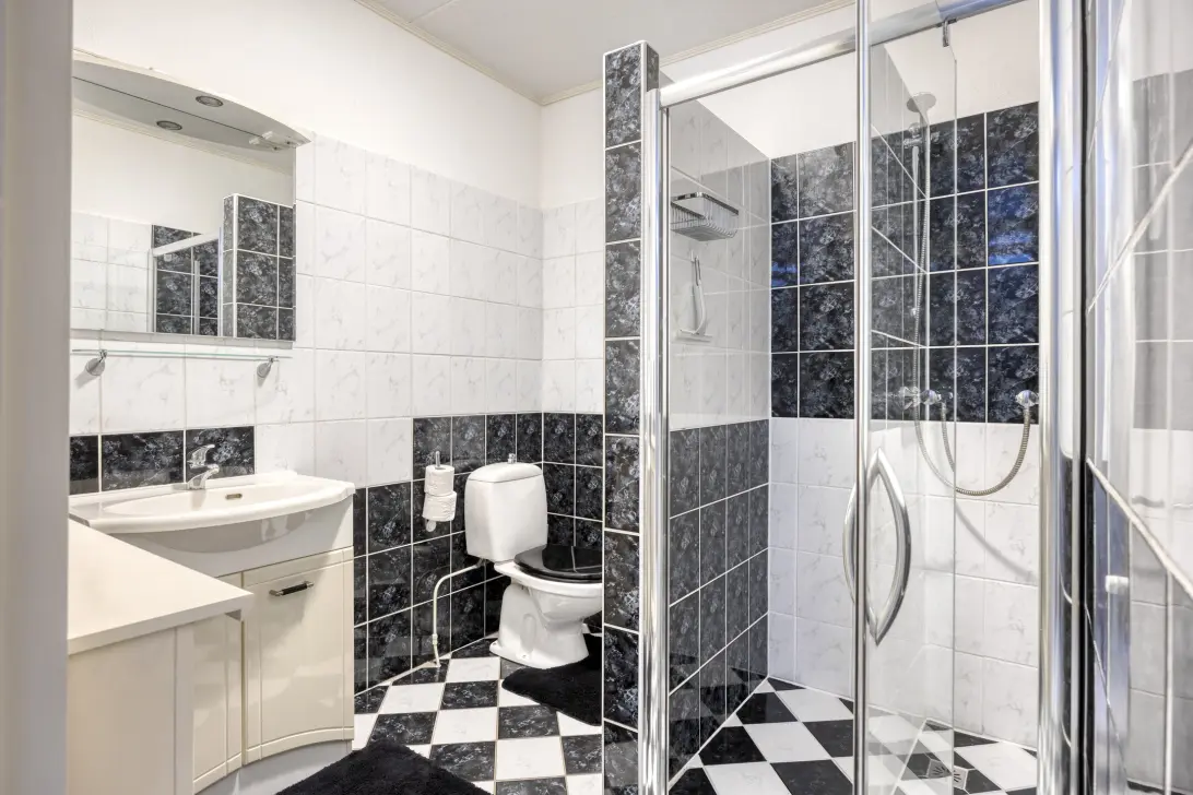 De laatste ruimte in het appartement is de badkamer, goed van formaat en met een ruime douche. Verder zijn er een toilet en een wastafelmeubel, met handige bergruimte in de kast. De thermostaatkraan en douchedeur zijn in 2005 geplaatst/vernieuwd.