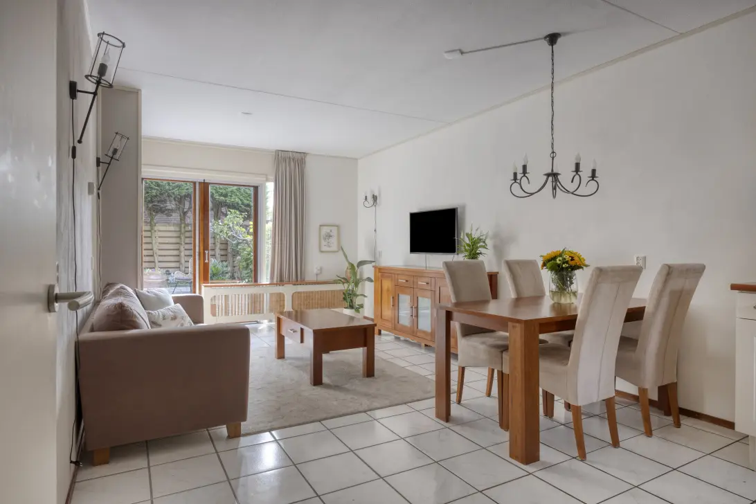 In de woonkamer ligt, net als in bijna het hele appartement, een lichte tegelvloer. Zoals je op de foto’s kunt zien is er genoeg plek voor een lekkere bank, een tv-meubel en de eettafel. De radiator heeft een ombouw gekregen, met een plank om je mooiste woonaccessoires een plekje te geven.