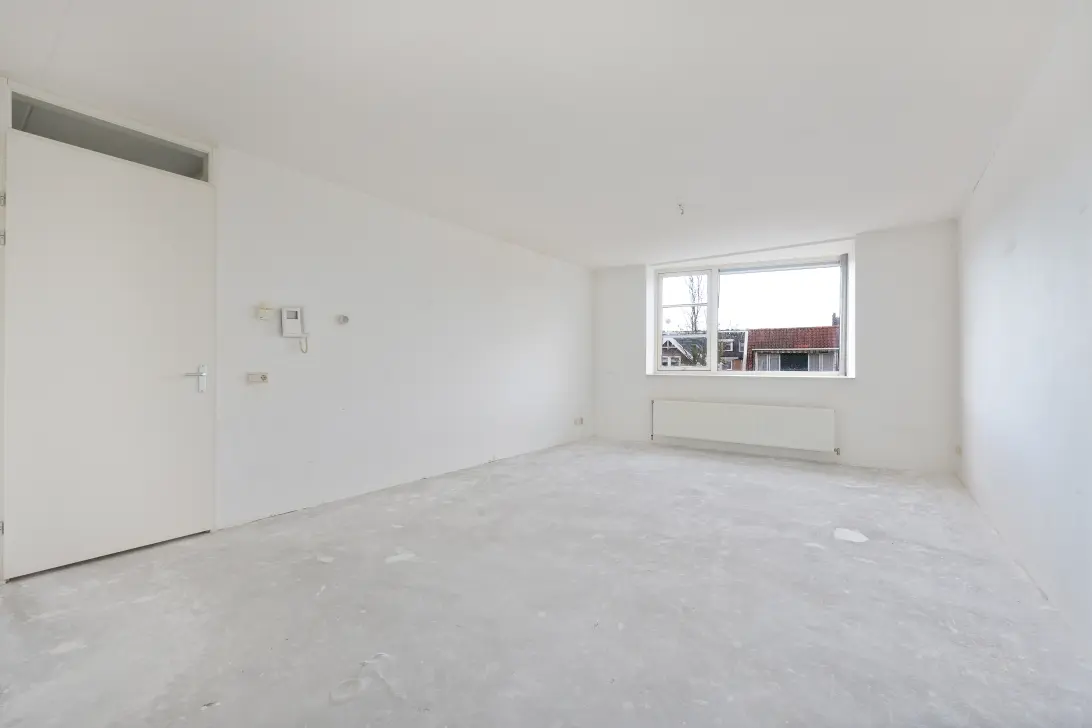 De hal met de meterkast, toilet met fontein, inpandige berging, de badkamer en toegang tot de woonkamer. De badkamer is uitgerust met een inloopdouche en een wastafel. De ruime slaapkamer is vanuit de woonkamer te bereiken. De woonkamer met erker en de open keuken. De keuken is voorzien van een combi-oven, vaatwasser, vriezer, koelkast en een 4-pits gasfornuis.