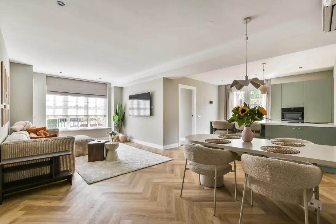 Binnen wordt u verwelkomd door een lichte, open leefruimte met een prachtige visgraatvloer. De grote ramen laten het daglicht rijkelijk binnenstromen en zorgen voor een warme, uitnodigende sfeer. Dit is de plek waar u heerlijk tot rust komt met een goed boek, of gezellig borrelt met familie en vrienden.