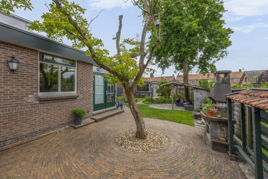 Dit verrassende woonhuis heeft een mooi aangelegde voor-, zij- en achtertuin. In de brede zijtuin is een eigen achterom en de achtertuin, met meerdere terrassen, heeft de wowfactor. Een van de terrassen, naast de boom, is overdekt en er staat een houten tuinhuis voor opslag.