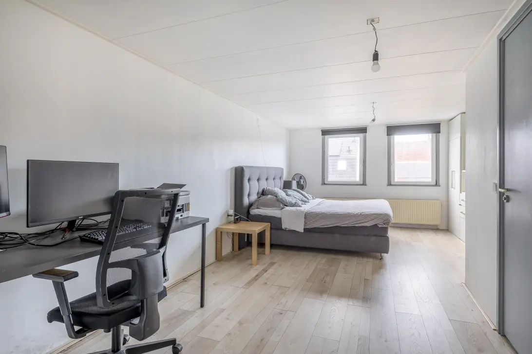 Op de eerste verdieping bevinden zich twee slaapkamers. Eén hele grote aan de achterzijde die nu in gebruik is als hoofdslaapkamer. Via deze slaapkamer kom je ook in de tweede badkamer voorzien van een douchecabine en een wastafel. De tweede slaapkamer aan de voorzijde kan je dan gebruiken als kantoor, logeerkamer of voor hobby's.
