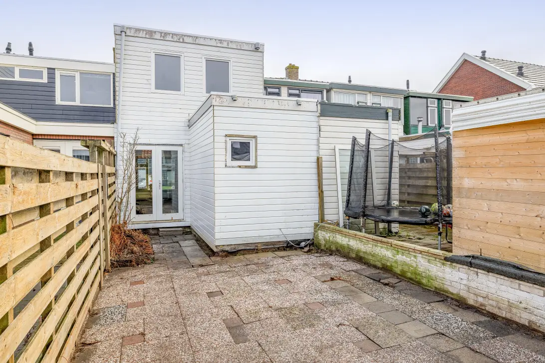De tuin dient nog te worden aangelegd. Deze tuin, op het noordwesten gelegen, biedt hier voldoende mogelijkheden voor. De vorige berging was in slechte staat en is weggehaald. Nu is er ruimte om zelf een schuur of overkapping te plaatsten. Goed om te weten is dat het achtererf bereikbaar is via dubbele poortdeuren. Ideaal voor de aanhanger of de motor.