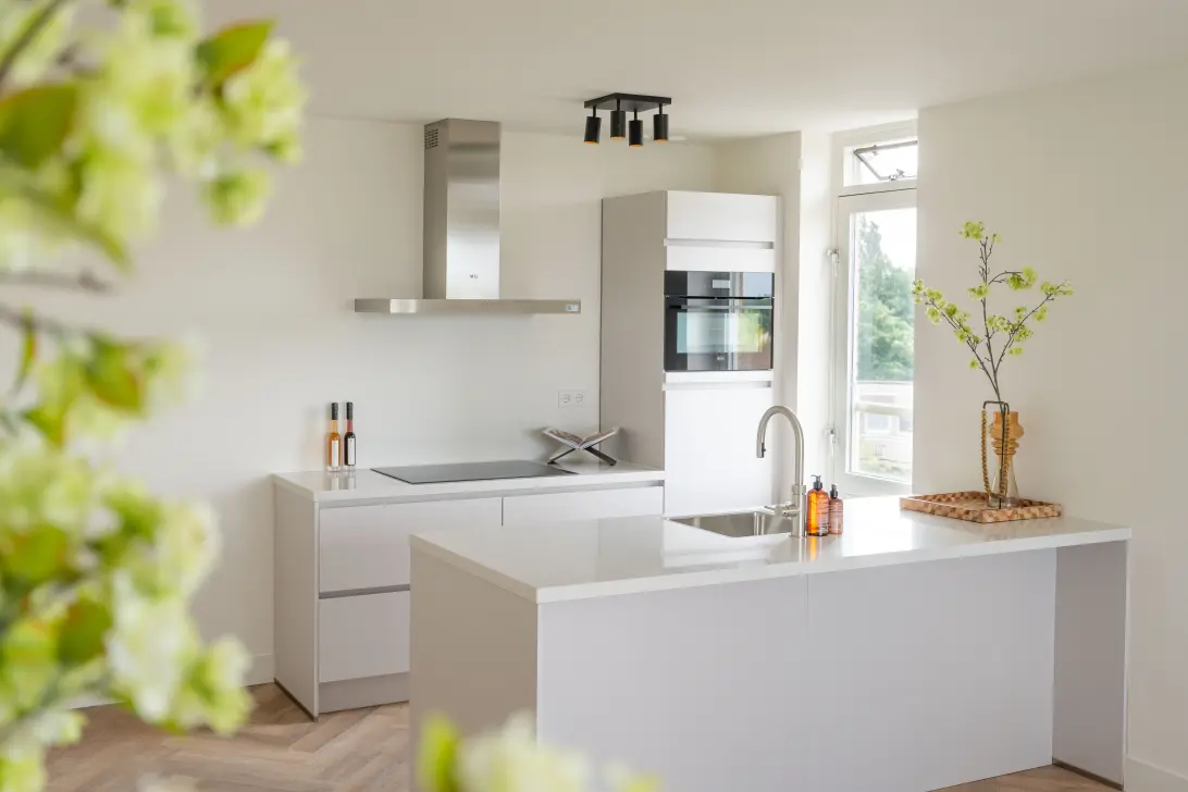 The combined surface area of the living room and kitchen is approximately 40 m². From the living room, there are sweeping views over much of Amstelveen and abundant greenery. The modern white kitchen with marble countertop is equipped with built-in appliances.