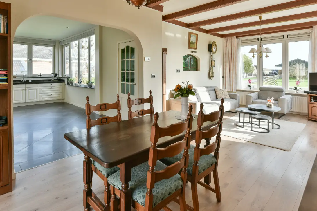 Als je binnenstapt in de woonkamer dan loop je direct naar de ramen aan de voorzijde en de zijkant om te genieten van het uitzicht op de monumentale boerderij op nummer 125, de boomgaard, de Drechtdijk en het polderlandschap. Wandelaars, fietsers, auto’s en tractoren, hier is altijd iets te zien.