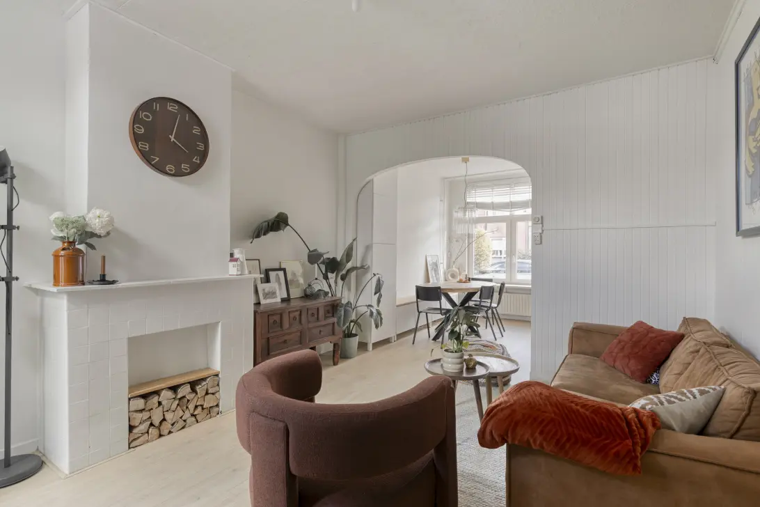De woonkamer is ruim opgezet en sfeervol ingericht, met als blikvanger een fraaie schouw. De zit- en eethoek zijn op speelse wijze van elkaar gescheiden door middel van een karakteristieke boog, wat zorgt voor een open maar toch duidelijke indeling van de ruimte. Via de openslaande deuren in de woonkamer heeft u direct toegang tot de tuin.