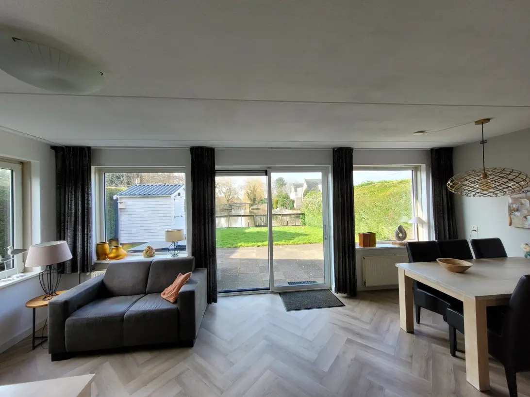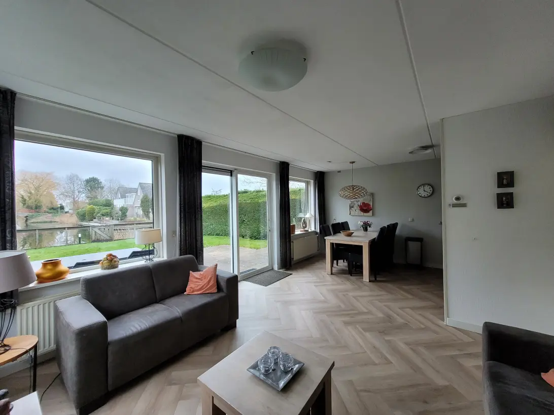 Begane grond: Via de zij-entree betreed je deze nette vrijstaande woning en kom je in de hal, die toegang biedt tot alle vertrekken. Aan de achterzijde van de woning bevindt zich de ruime en lichte leefruimte. De woonkamer is een fijne ruimte met veel daglicht en een prachtig vrij uitzicht over het water. De ruimte is modern afgewerkt met een stijlvolle visgraat pvc-vloer en een moderne keuken in rechte opstelling. Deze is uitgerust met een kookplaat, afzuigkap, oven, koelkast en vaatwasser. Op zonnige dagen kun je de schuifpui openen, het zonnescherm uitzetten en heerlijk genieten van de middag- en avondzon. Vanuit de hal zijn tevens twee slaapkamers bereikbaar, evenals de nette badkamer met ligbad en wastafel. Daarnaast is er een separate toiletruimte. Tot slot beschikt de woning over een praktische bijkeuken met de opstelling van de cv-ketel en aansluitingen voor wasmachine en droger.