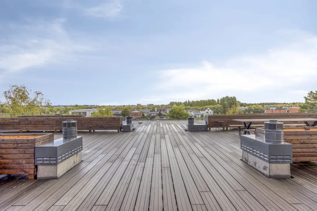 Dit appartement beschikt daarnaast over een gezamenlijk dakterras, waar bewoners kunnen genieten van het buitenleven midden in de stad. Het terras biedt een fijne plek om een kop koffie te drinken, een boek te lezen, gezellig samen te komen met buren of te genieten van het uitzicht op de Zaan. Dankzij de open ligging is er veel zonlicht en kun je hier heerlijk ontspannen na een drukke dag. Het gezamenlijke gebruik zorgt bovendien voor een prettige, sociale sfeer binnen het complex.