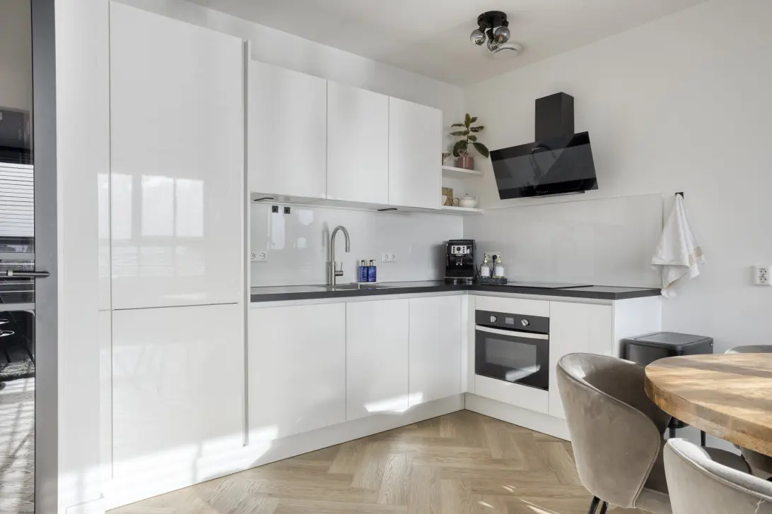 Bij binnenkomst in het appartement stap je de hal binnen, waar je direct toegang hebt tot het toilet en aan de andere kant de moderne badkamer, die is voorzien van inloopdouche en wastafel. Vanuit de hal loop je door naar de lichte woonkamer, die door de grote ramen een ruime en open sfeer heeft. De woonkamer staat in directe verbinding met de eetkamer en een fraaie keuken, die praktisch is ingedeeld en slim gebruik maakt van de beschikbare ruimte.