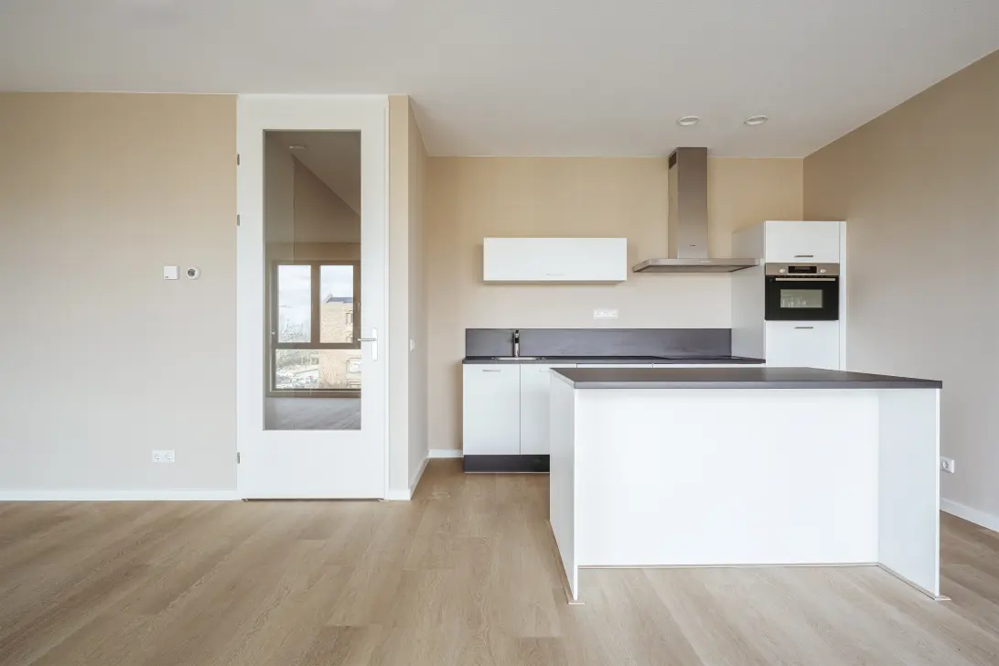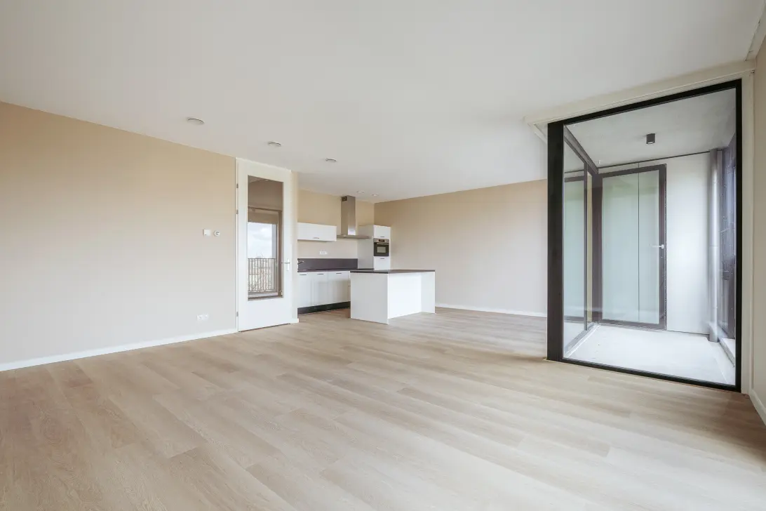 Vanuit de keuken/woonkamer heb je toegang tot de loggia waar je heerlijk kan genieten van de buitenlucht. Deze ruimte biedt privacy en een vrij uitzicht, waardoor het voelt als een oase midden in de stad.