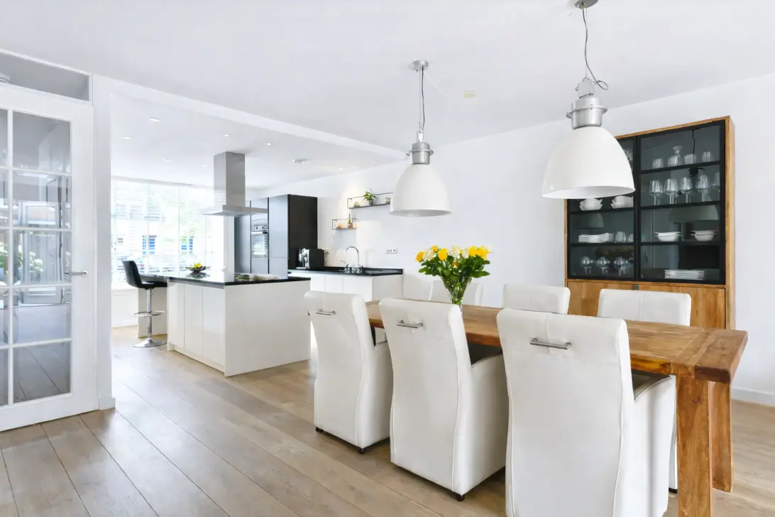 At the front, the open kitchen with a charming bay window is fully equipped. Here you’ll find a cooking island with a 5?burner induction cooktop and a stylish extractor hood, a Quooker for instant boiling water, and a large fridge?freezer combination. A perfect place to cook and enjoy family life.