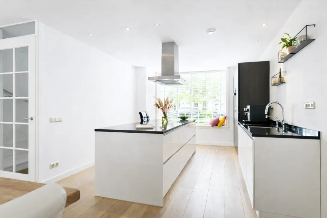 De open keuken aan de voorzijde, met sfeervolle erker, is van alle gemakken voorzien. Zo vind je hier een kookeiland met een 5-pits inductiekookplaat en een stijlvolle afzuigkap, een Quooker voor direct kokend water en een en een grote koel-vriescombinatie. Een perfecte plek om te koken en te genieten van het gezinsleven.