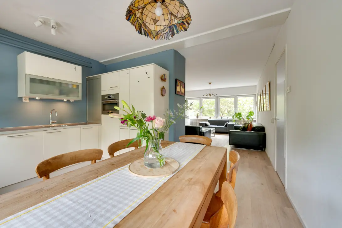 De royale woonkamer is heerlijk licht dankzij de grote raampartijen. Een stijlvolle toevoeging is de op maat gemaakte bar (2023), die zowel sfeer als extra opbergruimte biedt. De open keuken sluit hier naadloos op aan en is uitgerust met brede lades, een medicijnkastje, praktische hoekkast met rolluik, 5-pits gasfornuis met wokbrander, diverse inbouwapparatuur. Vanuit de keuken heb je toegang tot de loggia op het noorden – een beschut balkon met uitzicht op een groene, glooiende strook en de bomen langs de Lelylaan. Hier zit je 's avonds nog heerlijk in de zon, omringd door rust en natuur.