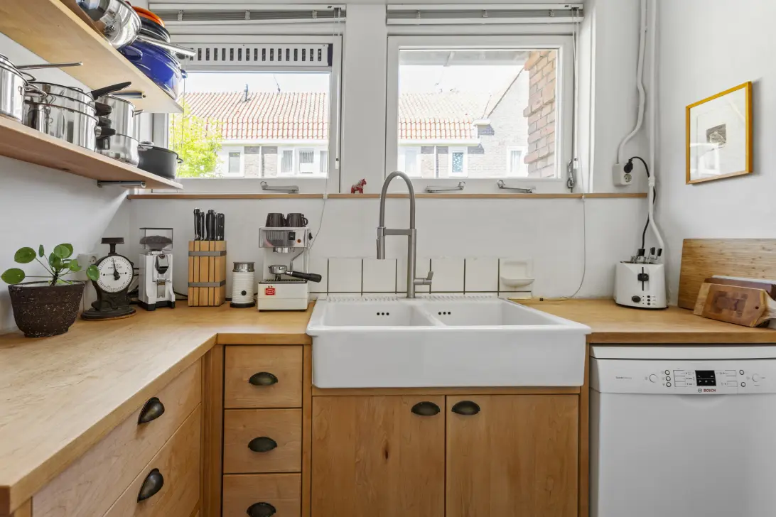 In de keuken, aan de voorzijde, staat een massief hardhouten keukenblok in een L-vorm, met een dubbele spoelbak en de originele wandtegels (met zeepbakje!).