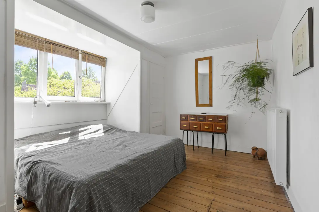 Originele houten vloeren en paneeldeuren bepalen ook de sfeer op de eerste verdieping, waar twee slaapkamers en de badkamer zijn. De ruime master bedroom, met een dakkapel en drie inbouwkasten, is aan de achterzijde en de slaapkamer aan de voorzijde is ingericht als werkkamer.
